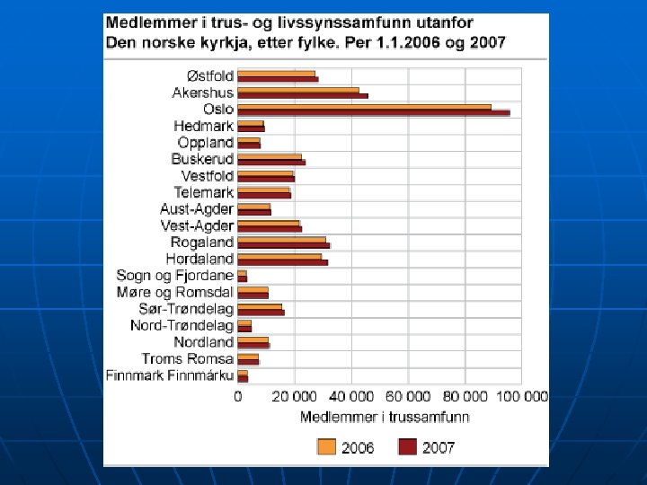 Medlemmer 1 i trus- og livssynssamfunn utanfor Den norske kyrkja, etter religion/livssyn. 1. januar 2005 og 2006 2005 2006 Medlemmer i alt 382 986 383 510 Baha'i 1 006 1 004 Buddhisme 9 471 9 934 Hinduisme 3 769 3 669 Islam 76 621 72 023 Jødedom 909 870 Kristendom 215 090 216 141 Den romersk-katolske kyrkja 43 118 46 440 Pinsemenigheiter 42 744 39 492 Den Evangelisk Lutherske Frikyrkja i Noreg 21 140 19 308 Jehovas vitner i Noreg 14 502 14 568 Svenska Margaretaførsamlingen i Oslo 27 267 12 166 Metodistkyrkja i Noreg 11 981 11 324 Andre kristne trussamfunn 74 338 72 843 Sikhisme 2 298 2 257 Human-Etisk Forbund 72 699 76 470 Andre trus- og livssynssamfunn 1 123 1 142 1 Omfattar berre medlemmer det blir motteke offentleg stønad for. 2 Berekna etter gamal metode. Kjelde: Statistisk sentralbyrå.