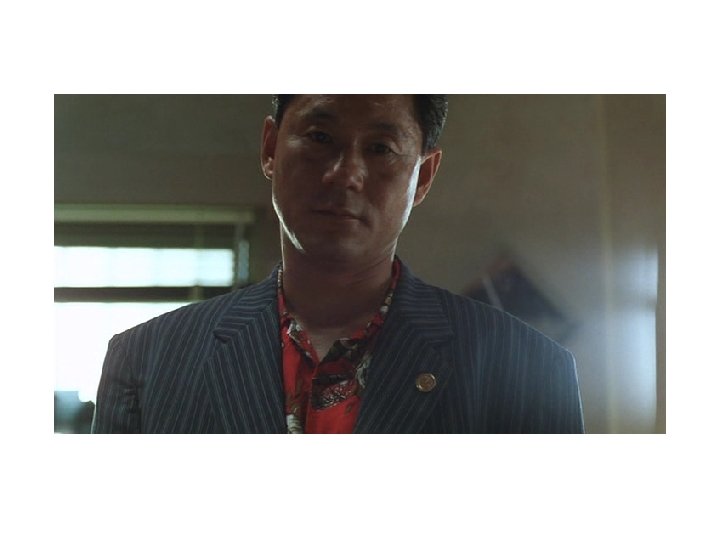 Kitano’s Mannerist Style; Mise-en-scène • Mannerist distortions of the cinematic conventions • Spatial treatment and screen composition • e. g. medium shot of three people with too much head space in Boiling Point • e. g. medium shot of the killer whose face is cut by the top edge of the screen