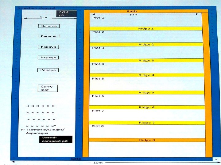 • Ridge 1 -3: Turnip (PTWG) followed by radish (Japanese White) • Ridge 4: Beet Root (Detroit Dark Red) followed by colocasia (Local) • Ridge 5 -6: Carrot (Nantes/Pusa Kesar) followed by colocasia (Local) • Ridge 7: Radish followed by colocasia • Perennial Plots • Turmeric: 6 rows; banana and papaya 3 in a row; Curry leaf 1 plant and asparagus- 3 small rows • Other space: • Grow rows of leafy vegetables, ginger etc. on both sides of the path. • Pole beans should be trained on the gate side of fence. • Pea in winter followed by cucurbits in summer can be trained on remaining three sides of the fence.