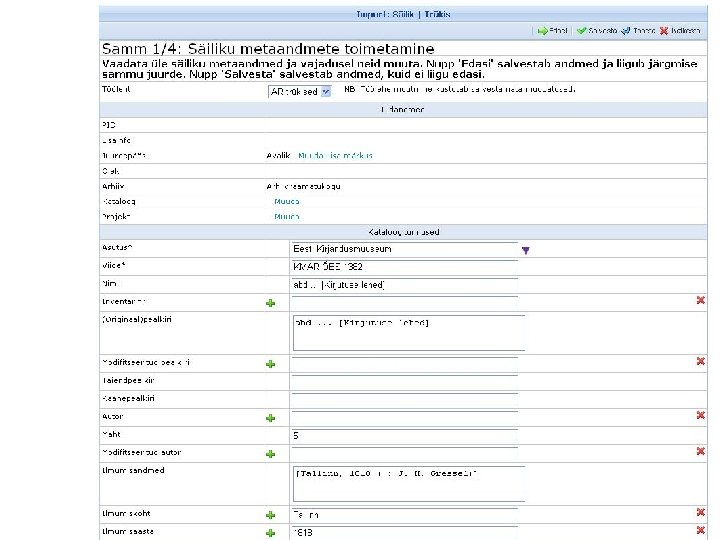 Failide importimine repositooriumi • Digiteerijad saadavad ftp-ga xml-kapslites tiff-failid kivikese serveri defineeritud sisendalasse • Vastavate õigustega töötajad (defineeritud rollipõhiselt) saavad sealt valida imporditavad failigrupid. • Importija saab valida töölehe arhiivispetsiifiliste metaandmeväljadega (sh funktsioon “tee vanast uus”). • Faile saab importida repositooriumisse ka otse oma arvutist või kõvakettalt (nii ühekaupa kui masslaadimisena)