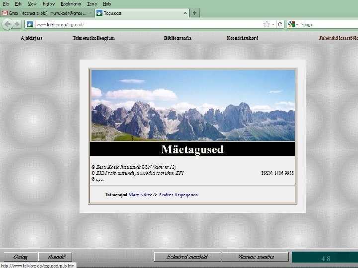 Võrgus kättesaadavad Eesti Kirjandusmuuseumi materjalid: • Folkloristide andmebaasid ja tekstikorpused (ca 20) http: //www. folklore. ee/ebaas/, sh avatud juurdepääsuga teadusajakirjad Folklore http: //www. folklore. ee/folklore/ Mäetagused http: //www. folklore. ee/tagused/ • EKLA Kreutzwaldi sajand http: //kreutzwald. kirmus. ee/ Methis http: //methis. ee/ • AR virtuaalraamatukogu GRAFO http: //www 2. kirmus. ee/grafo/ • ERAs varem digiteeritud käsikirjad http: //www. folklore. ee/kasikirjad/