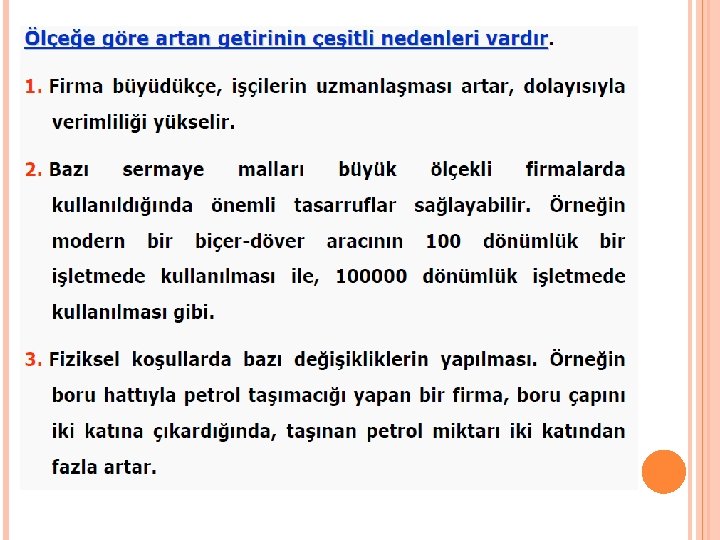 OPTİMUM KAPASİTE VE UYGUN KURULUŞ ÖLÇEĞİNİN SEÇİMİ UZUN DÖNEM: Production in the long run tüm üretim faktörleri değiştirilebilmektedir. Bu değişme , işletme ölçeğinde bir değişmeyi ifade eder. Üretim ölçeğinde meydana gelen değişmeler sonucu üretim miktarında meydana gelen değişmelere ÖLÇEĞE GÖRE GETİRİ denilmektedir. Üretim miktarıyla yakından ilgili olan bu ölçek değişmeleri üretim miktarını hep aynı yönde ve aynı oranda değiştirmez. Bütün üretim faktörleri birlikte ve aynı oranda değiştirildiğinde üç çeşit ölçeğe göre getiri durumu ortaya çıkar: ÖLÇEĞE GÖRE SABİT GETİRİ ÖLÇEĞE GÖRE AZALAN GETİRİ ÖLÇEĞE GÖRE ARTAN GETİRİ