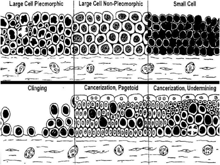 Pět morfologických forem uroteliálního CIS v v velkobuněčný s atypiemi velkobuněčný bez atypií malobuněčný clinging kancerizace urotelu pagetoidní nebo podrůstající jednotlivé typy se často kombinují
