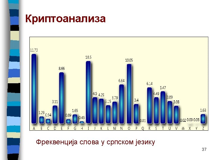 Začeci analize frekvencija se mogu naći u 14. veku u delu arapskog autora Ibn ad-Duraihima, a izgleda da su tu metodu u isto vrijeme poznavali i italijanski kriptografi. Navešćemo osnovne podatke za naš, engleski i nemački jezik. Smatramo da u tekstu nema interpunkcijskih znakova, ni razmaka između reči (u protivnom bi kriptoanaliza bila puno lakša), kao i da su slova Č, Ć, Đ, Dž, Lj, Nj, Š, Ž zamijenjena na napred opisan način. FREKVENCIJA SLOVA (u promilima) NAŠ JEZIK A I O E N S R J T U D K V L M P C Z G B H F 115 98 90 84 66 56 54 51 48 43 37 36 35 33 31 29 28 23 16 15 8 3 ENGLESKI E T A O I N S H R D L C U M W F G Y P B V K J Q XZ 127 91 82 75 70 67 63 61 60 43 40 28 28 24 23 22 20 20 19 15 10 8 2 1 1 1 NJEMAČKI E N I R S A T D H U L G O C M B F W K Z P V J Y XQ 175 98 77 75 68 65 61 48 42 42 35 31 30 27 26 19 17 15 15 11 10 9 3 1 0 0