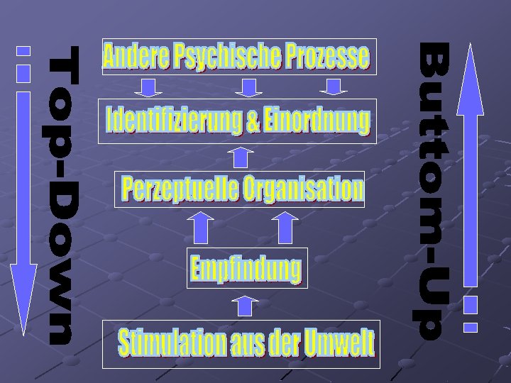 Bottom-up & Top-Down Bottom up n n Aufnahme sensorischer Information in das System durch die Rezeptoren Filterung und Analyse relevanter Informationen von konkreten Reizmerkmalen des Stimulus zu abstrakten Repräsentationen Datengeleitete Verarbeitung Top Down n n Auswirkung von Erfahrungen, Wissen, Erwartungen und kulturellem Hintergrund auf die Wahrnehmung sie das Objekt ihrer Wahrnehmung und Interpretation (Kategorisierung) Konzept- bzw. Hypothesengeleitete Verarbeitung Interaktion der beiden Prozesse bestimmt, wie wir etwas wahr nehmen