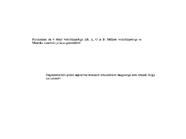 Ülesanne Pärast autoõnnetust tuuakse kiirabiga haiglasse kolmeliikmeline perekond. Isa ja ema pole kuigi raskelt viga saanud, aga nende nelja-aastane poeg vajab kiiresti vereülekannet. Usulistel põhjustel ei ole vanemad soovinud teada saada lapse veregruppi, mistõttu nad ei oska seda arstidele öelda. Küll aga teavad nad enda veregruppe: mehel AB ja naisel 0. Kas selle info põhjal on arstidel võimalik kindlaks teha, millise grupi verd tohib poisile üle kanda? Mis on poisi genotüüp / võimalikud genotüübid?