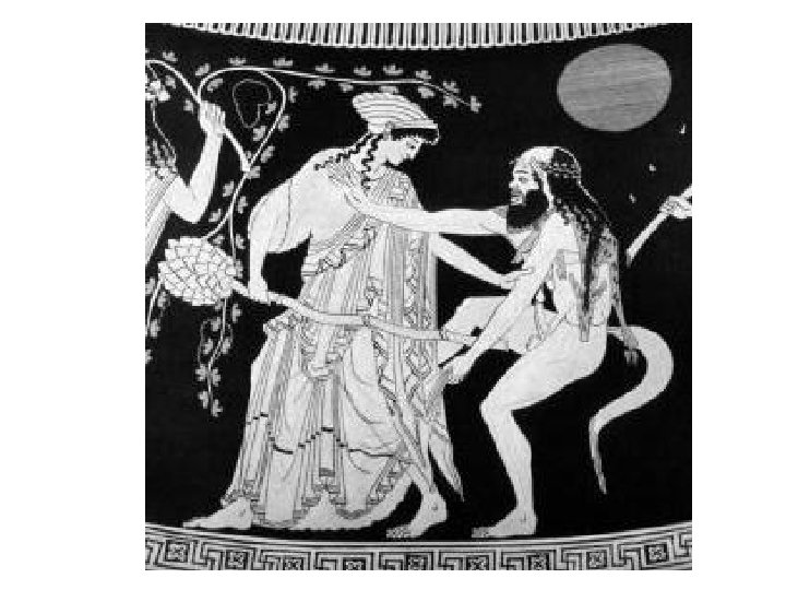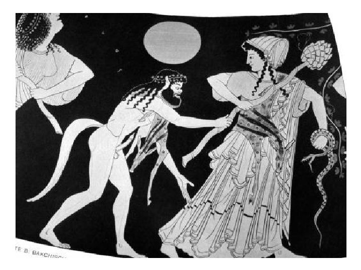 Subject: Body • Two Maenads on either side of the god are being attacked by Silenoi. • Right Maenad fends Silenoi off with her thyrsos. • Left Maenad holds a snake.