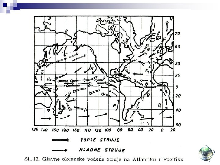 Klimatski modifikatori Modifikatori prvog reda Uticaj okeanskih struja na klimu q q q Stalni vetrovi obrazuju okeanske struje koje imaju isti pravac kao vetrovi Na svom putu nailaze na kontinente i menjaju pravac (npr. Ekvatorijalna struja se deli na Golfsku i Brazilsku) Tople struje na obalama izazivaju povećanje relativne vlažnosti vazduha, oblačnosti i količine padavina. Topla Golfska struja dolazi od obala severozapadne Evrope. Na atlantskim obalama Francuske uspevaju kamelije, bambusi i smokve; uz obale Norveške ima višanja, jabuka i žita sve do 65 o s. š. i ječma do 70 o s. š. Prisustvo vodenih basena najviše utiče na temperaturu vazduha