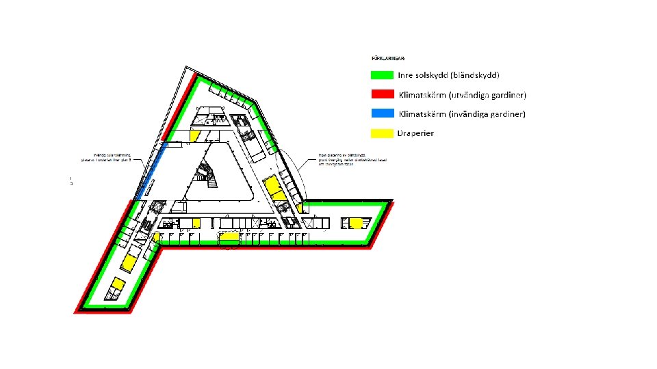 Funktion • Byggnadens klimatskärm • De yttre gardinerna är en del av byggnadens klimatskärm. Hindrar solinstrålning från att ta sig in i rummen, med syftet att upprätthålla god komfort och minimera behovet av kylenergi. • Inre solskydd • Hyresgästen har rådighet över inre gardiner, vars syfte är att man inte ska bländas av solstrålning. Dessa är oberoende av byggnadens klimatskärm.