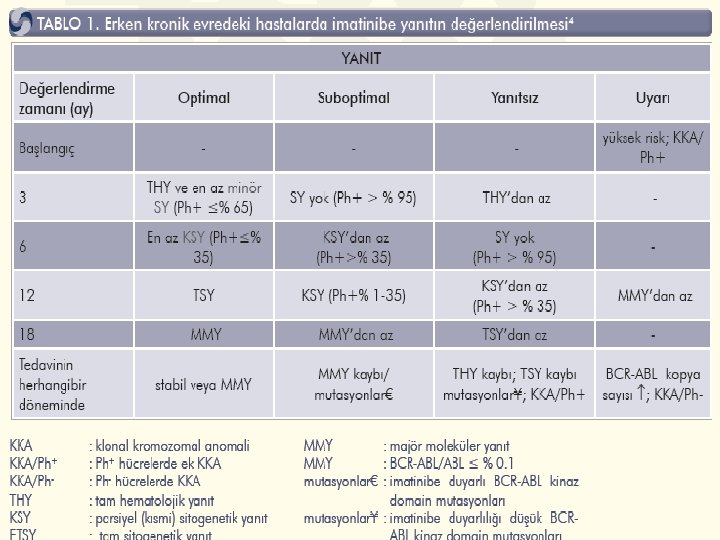 Hematolojik, Sitogenetik ve Moleküler Yanıt Tanımları Hematolojik TAM (THY) Lökosit < 10 x 109/L Bazofil < % 5 Periferik yaymada miyelosit, promiyelosit, miyeloblast yok Trombosit sayısı < 450 x 109/L Dalak palpe edilemez Sitogenetik Moleküler Tam (TSY) Ph+ metafaz yok Kısmi (KSY) % 1 -35 Ph+ metafaz Minör (minör. SY) % 36 -65 Ph+ metafaz Minimal (min. SY) % 66 -95 Ph+ metafaz Yok (SY yok) > %95 Ph+ metafaz Tam (TSY) BCR-ABL m. RNA transkriptinin, uygun kalitede ardışık 2 kan örneğinde gerçek zamanlı ve/veya nested PCR ile tespit edilememesi (duyarlılık > 104) Majör (MMY) BCR-ABL’nin ABL’ye ( veya diğer kontrol genlerine) oranının uluslar arası ölçekte ≤ % 0. 1 olması Baccarani et. al. , JCO 2009; 10. 1200/JCO. 2009. 25. 0779