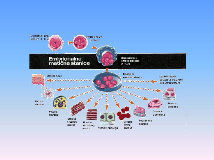 • Embrij se tada može implantirati u maternicu surogat majke, gdje će se, u rijetkim slučajevima kada se sve odvija po planu, nastaviti razvijati dok ne dođe vrijeme da mlado dođe na svijet. Postoji i druga mogućnost, a to je da se embrij zadrži u maternici samo dotle dok se iz embrioblasta ne uspiju izdvojiti embrionalne matične stanice koje se dalje mogu držati u kulturi. Znanstvenici vjeruju da bi ovaj temeljni princip kloniranja trebao biti djelotvoran i u slučaju ljudi. Ustvari, pokušaj kloniranja čovjeka koji sam prije spomenula izvršen je s namjerom da se dobiju embrionalne matične stanice. Kloniranje u tu svrhu naziva se terapijsko kloniranje.