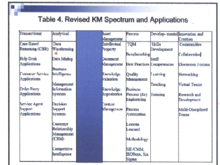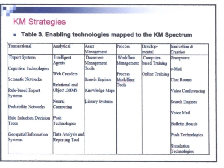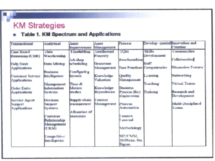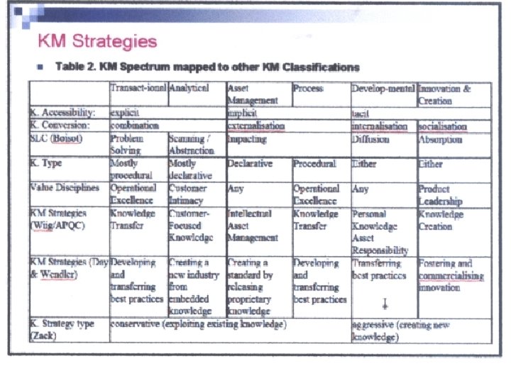 KM Strategies n Derek Binney (Binney, 2001) provides a framework, The KM Spectrum, to help organisations make sense of the large diversity of material appearing under the heading of KM, and to help them assess where they are in KM terms. His focus is on the KM activities that are being carried out, grouped into six categories: ¨ ¨ ¨ Transactional KM: Knowledge is embedded in technology. Analytical KM: Knowledge is derived from external data sources, typically focussing on customer-related information. Asset Management KM: Explicit management of knowledge assets (often created as a by-product of the business) which can be reused in different ways. Process-based KM: The codification and improvement of business practice and the sharing of these improved processes within the organisation. Developmental KM: Building up the capabilities of the organisation's knowledge workers through training and staff development. Innovation/creation KM: Fostering an environment which promotes the creation of new knowledge, for example through R & D and through forming teams of people from different disciplines.