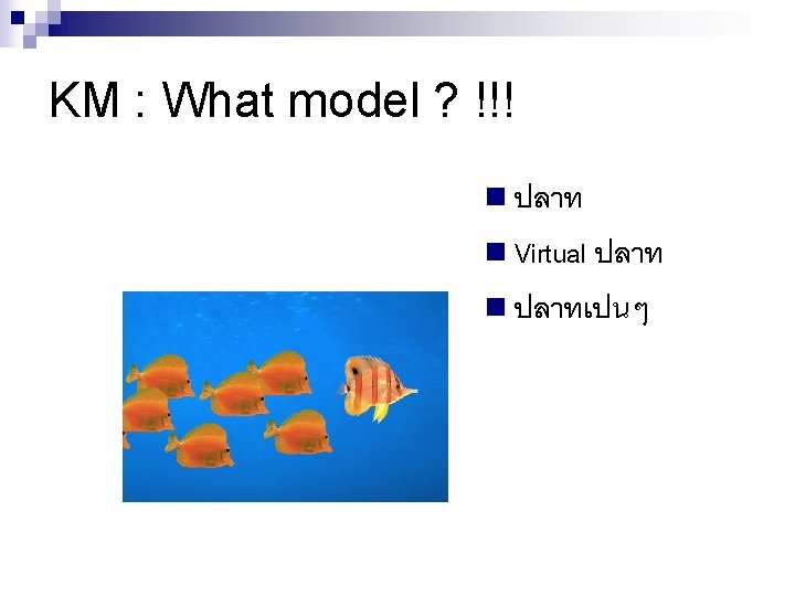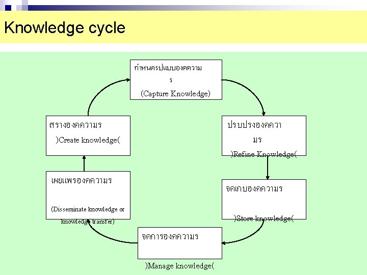 Key concept : 2. . . Individual – Organization synergy by making most benefit from Utilizing Tools and Technology n Tacit / Implicit / Explicit Knowledge (ความรฝงลก /ความรแฝง /ความรทตพมพ แสดงได ( n Tacit ¨ Expert connectivity n Implicit ¨ Knowledge Presentation ¨ Knowledge acquisition / extraction n Explicit Knowledge ¨ Information retrieval -เปดเผย -
