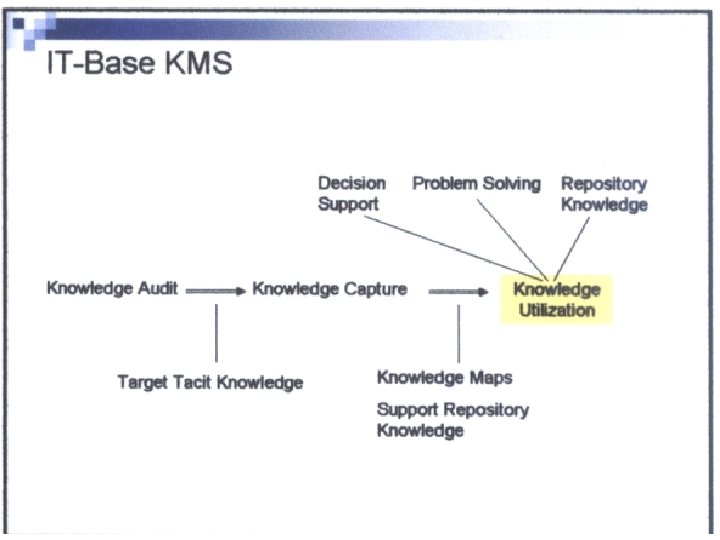 Explicit knowledge Knowledge Access n Knowledge Validation n Knowledge Valuation n Knowledge Optimization n Knowledge Dissemination n ¨ Knowledge Sharing / Brokering ¨ Edutainment ¨ Collaborative tools