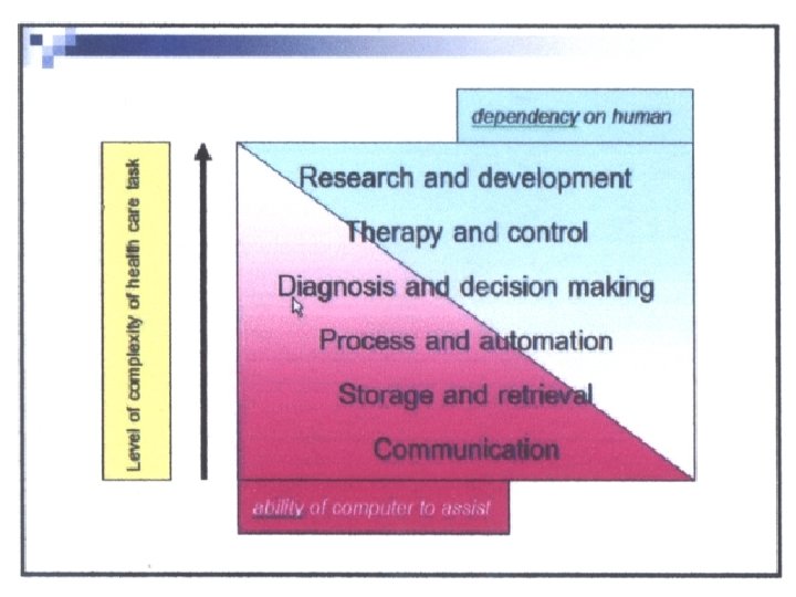 The foreseeable future Rapid access to a growing body of knowledge : “Competitive intelligent”. To find out “Competitive advantage”. n The skill required by the practitioner is to know how to sift and find information, rather than how to remember facts. n Health informatics is going to be an essential clinical skill. n