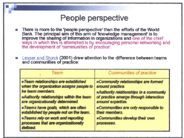 Evolution of KM n Wave 1 IT dominated approach ¨ Misleading dichotomy of tacit/explicit ? ¨ n Wave 2 Importance of relationships, connections ¨ Recognized rise of social capital ¨ Decline of CKO ? ¨ n Wave 3 COP ¨ Focus on how people make decision ¨ Alignment with business imperative, quality management, risk management etc. ¨