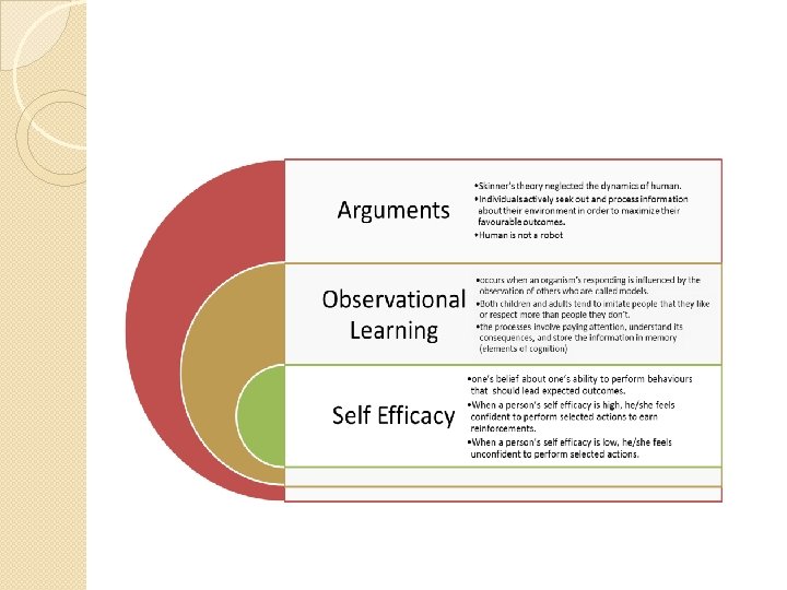 2. 3 Bandura’s Social Cognitive Theory: Albert Bandura Arguments � Humans are dynamics. � Conditioning is not mechanical process in which people are passive participants. � Individuals actively seek out and process information about their environment in order to maximize their favourable outcomes. � Human is not a robot (Stimulus Response)