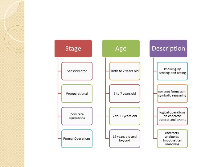 Cognitive Development Theory: Jean Piaget - Stages of Cognitive Development - Stage 3: Concrete Operational � Children (6/7 to 11 years of age) can perform logical operations, but only in relation to concrete external objects rather than ideas. � They can add, subtract, count, and measure, and they learn about the conservation of length, mass, area, weight, time, and volume. � At this stage, children can sort items into categories, reverse the direction of their thinking, and think about two concepts, such as length and width, simultaneously. � They also begin to lose their egocentric focus, becoming able to understand a situation from the viewpoint of another person.