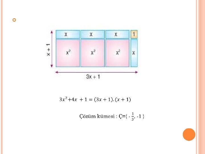 UYGULAMA: 1. dereceden bir bilinmeyenli denklem çarpımı Denklemin çözüm kümesi DENKLEM x 2–x– 6 = 0 x 2+5 x+4 = 0 10 x 2–x– 3 = 0 9 x 2– 25 = 0 (x– 3). (x+2) = 0 Ç = {– 2, 3}