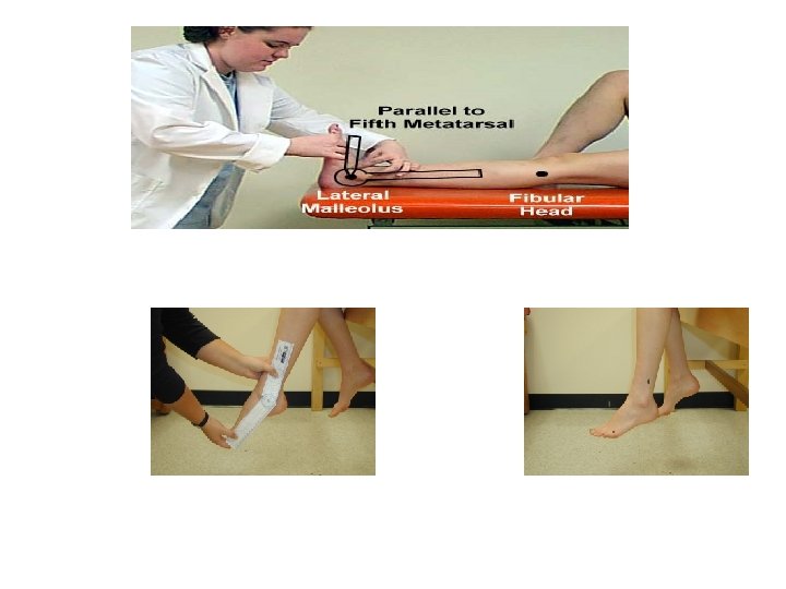 Measurement of circumference of the knee Swelling around the knee joint 1. 2. 3. - at middle of patella -below the patella 5 cm -above the patella 5 cm Muscle atrophy: 1. 2. 3. 4. Above the patella 10 cm Above the patella 15 cm Above the patella 20 cm Above the patella 25 cm