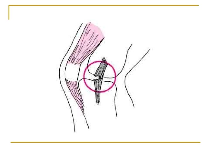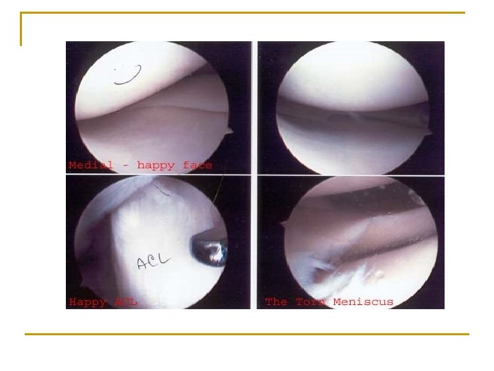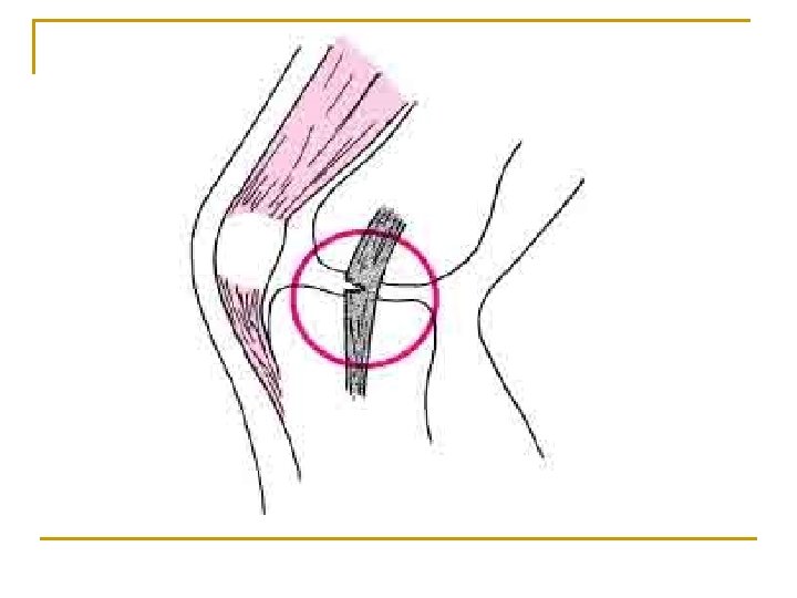 Meniscal Tear n n Cause: A weight bearing combined with a rotational force while extending of flexing the knee. Medial more common than lateral. Acute vs. Chronic S/S: Effusion on joint line, loss of motion, joint locking, and pain when squatting. TX: RICE n n n quad sets Surgery possible ST: Mc. Murray’s, Apley’s compression test