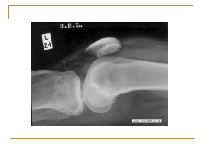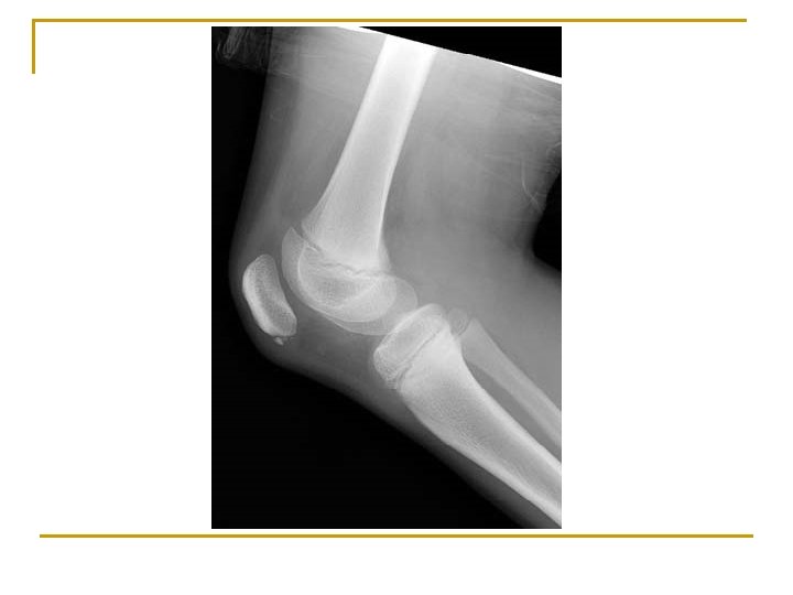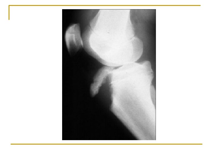 Osgood-Schlatter’s Disease n n n Cause: common in immature athletes. Repeated pull of the patellar tendon at the tibial tubercle. S/S: Swelling, hemorrhage, and gradual degeneration of tubercle (causing deformity) TX: Conservative: RICE (ice cups) n n n Out for 6 months to 1 year Rehabilitation ST: X-Ray