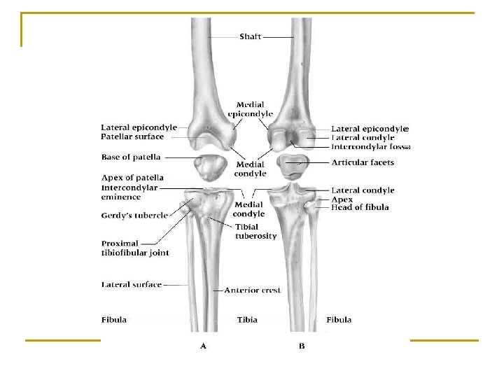Knee Structures n n Hinge Joint Stability comes from ligamentous support Femur, tibia, fibula, patella Menisci ~ 2 oval fibrocartilages