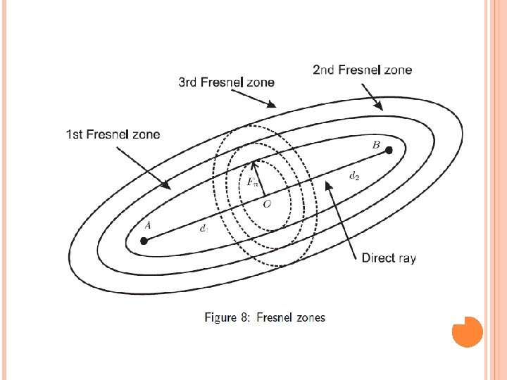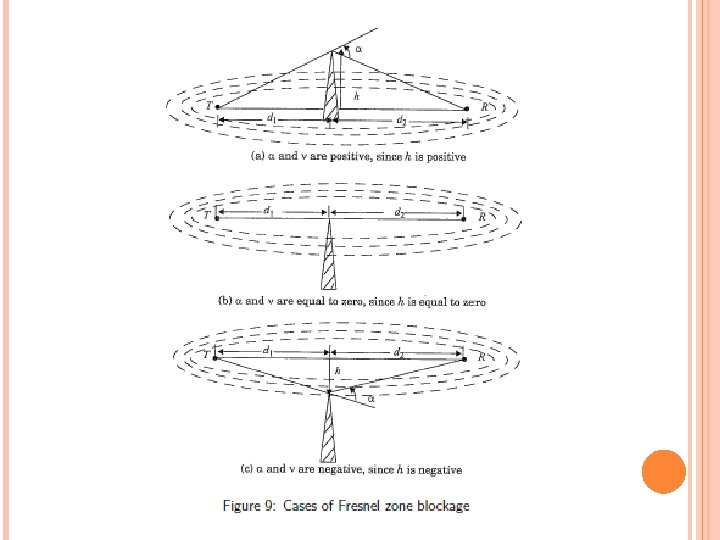 Fn depends on the distances d 1 and d 2 to the obstruction Fn is maximum when d 1 = d 2. The circles shrink as the obstruction is moved closer to the transmitter or receiver. Fresnel zones are elliptical in shape with the Transmitter and Receiver antenna at their foci. If an obstruction doesn’t block the volume contained within the first Fresnel zone, the diffraction loss will be minimal and can be neglected. If about 55% of the first Fresnel zone is clear then further Fresnel zone clearance doesn’t significantly alter the diffraction loss.