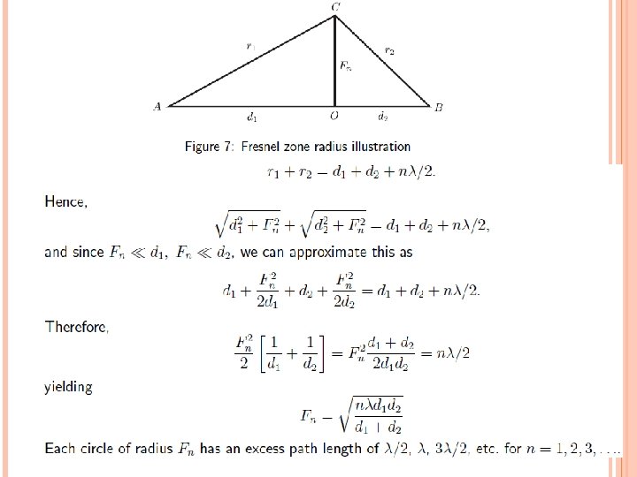 FRESNEL ZONES If the height h is chosen such that the path length difference between the diffracted path and LOS path ∆ is one halfwavelength (λ/2), the diffracted wave has incurred a 180 degree phase shift relative to the LOS wave. This is true over a locus of point forming a ring in the plane of the screen. Such a ring or circle is called a Fresnel zone. This process repeats, giving us alternating Fresnel zones that provide constructive and destructive interference to the total received signal every λ/2 increase in h.