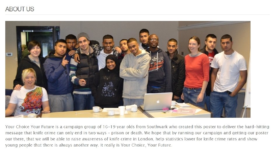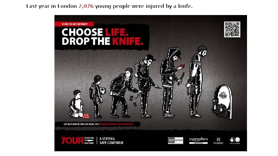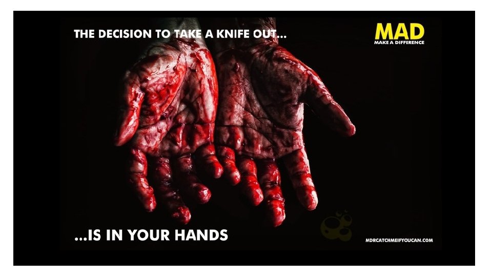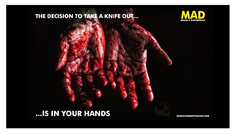 Fact! • 99% of young people aged 10– 29 don’t carry a knife. • People who carry a weapon are more likely to be hospitalised with an injury caused by violence. • There is no ‘safe place’ to stab someone – any stab can be fatal – and the consequences will be just as severe.