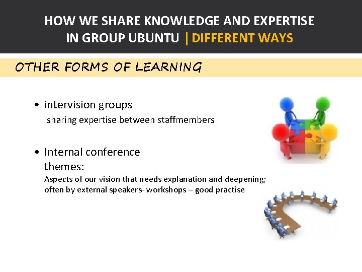 HOW WE SHARE KNOWLEDGE AND EXPERTISE IN GROUP UBUNTU | DIFFERENT WAYS OTHER FORMS OF LEARNING • intervision groups sharing expertise between staffmembers • Internal conference themes: Aspects of our vision that needs explanation and deepening; often by external speakers- workshops – good practise