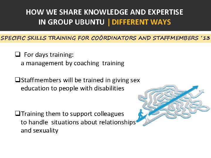 HOW WE SHARE KNOWLEDGE AND EXPERTISE IN GROUP UBUNTU | DIFFERENT WAYS SPECIFIC SKILLS TRAINING FOR COÖRDINATORS AND STAFFMEMBERS ‘ 13 q For days training: a management by coaching training q. Staffmembers will be trained in giving sex education to people with disabilities q. Training them to support colleagues to handle situations about relationships and sexuality