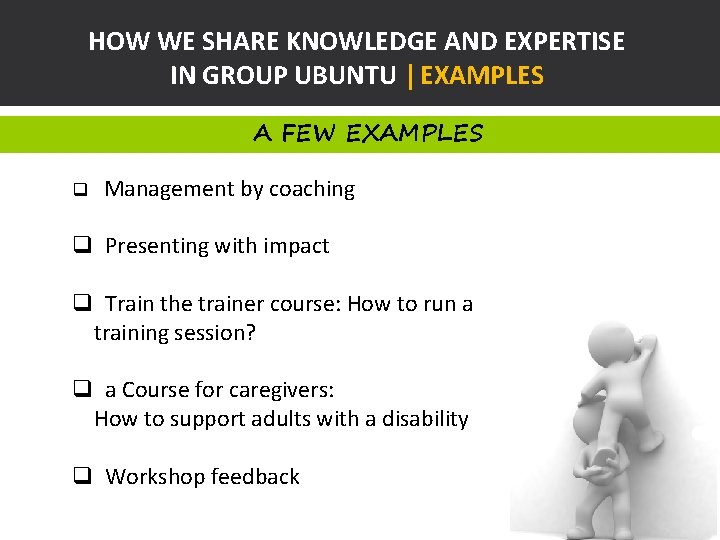 HOW WE SHARE KNOWLEDGE AND EXPERTISE IN GROUP UBUNTU | EXAMPLES A FEW EXAMPLES q Management by coaching q Presenting with impact q Train the trainer course: How to run a training session? q a Course for caregivers: How to support adults with a disability q Workshop feedback