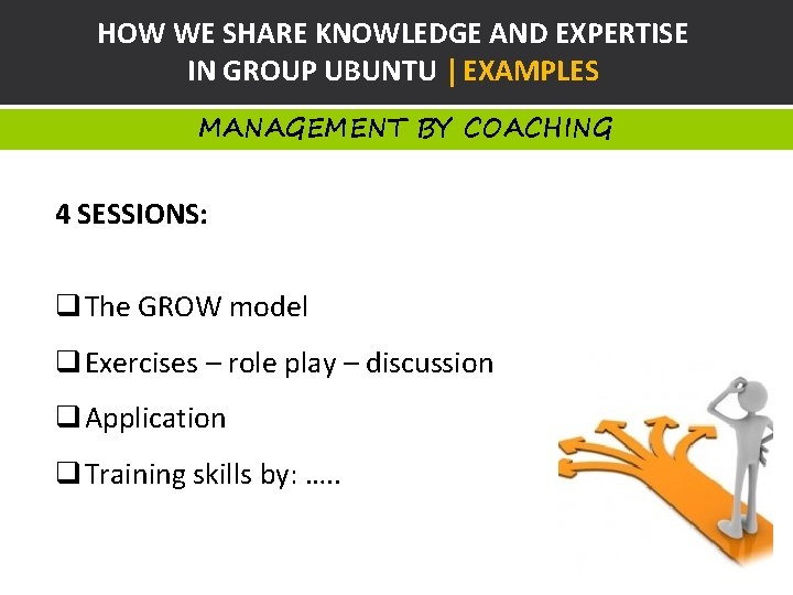 HOW WE SHARE KNOWLEDGE AND EXPERTISE IN GROUP UBUNTU | EXAMPLES MANAGEMENT BY COACHING 4 SESSIONS: q The GROW model q Exercises – role play – discussion q Application q Training skills by: …. .