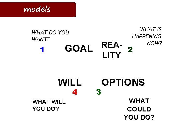 models WHAT IS HAPPENING NOW? WHAT DO YOU WANT? 1 REAGOAL 2 LITY WILL 4 WHAT WILL YOU DO? 3 OPTIONS WHAT COULD YOU DO?