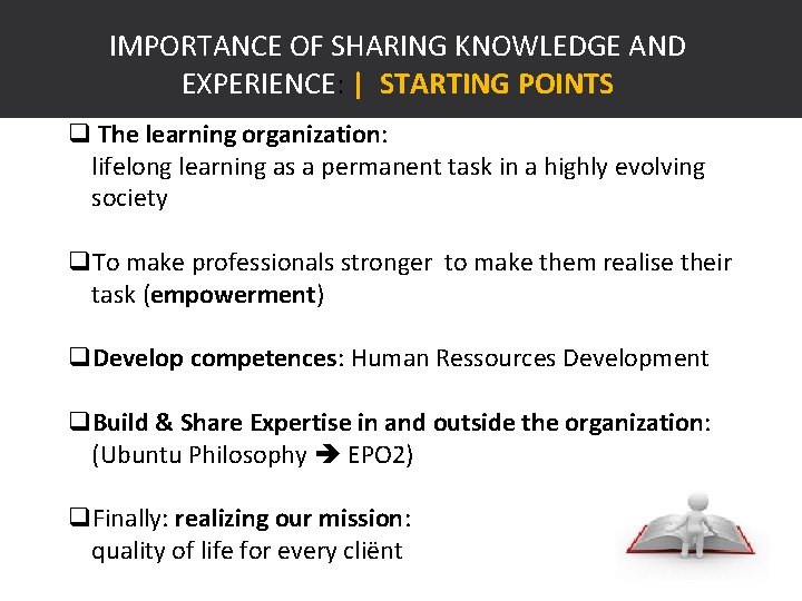 IMPORTANCE OF SHARING KNOWLEDGE AND EXPERIENCE: | STARTING POINTS q The learning organization: lifelong learning as a permanent task in a highly evolving society q. To make professionals stronger to make them realise their task (empowerment) q. Develop competences: Human Ressources Development q. Build & Share Expertise in and outside the organization: (Ubuntu Philosophy EPO 2) q. Finally: realizing our mission: quality of life for every cliënt