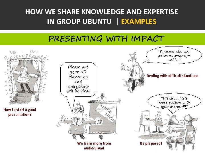 HOW WE SHARE KNOWLEDGE AND EXPERTISE IN GROUP UBUNTU | EXAMPLES PRESENTING WITH IMPACT “Someone else who wants to interrupt me? ? . . . ” Please put your 3 D glasses on and everything will be clear Dealing with difficult situations “Please, a little more passion with your marker!!!” How to start a good presentation? We learn more from audio-visual Be prepared!