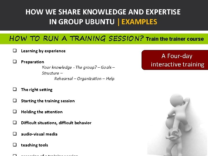 HOW WE SHARE KNOWLEDGE AND EXPERTISE IN GROUP UBUNTU | EXAMPLES HOW TO RUN A TRAINING SESSION? q Learning by experience q Preparation Your knowledge - The group? – Goals – Structure – Rehearsal – Organization – Help q The right setting q Starting the training session q Holding the attention q Difficult situations, difficult behavior q audio-visual media q teaching tools Train the trainer course A Four-day interactive training