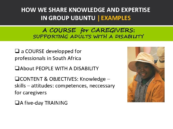 HOW WE SHARE KNOWLEDGE AND EXPERTISE IN GROUP UBUNTU | EXAMPLES A COURSE for CAREGIVERS: SUPPORTING ADULTS WITH A DISABILITY q a COURSE developped for professionals in South Africa q. About PEOPLE WITH A DISABILITY q. CONTENT & OBJECTIVES: Knowledge – skills – attitudes: competences, neccessary for caregivers q. A five-day TRAINING