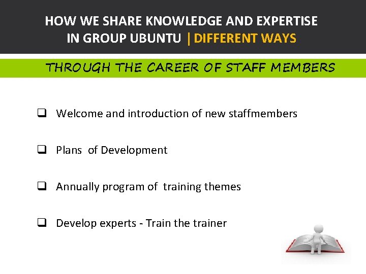 HOW WE SHARE KNOWLEDGE AND EXPERTISE IN GROUP UBUNTU | DIFFERENT WAYS THROUGH THE CAREER OF STAFF MEMBERS q Welcome and introduction of new staffmembers q Plans of Development q Annually program of training themes q Develop experts - Train the trainer