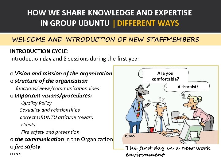 HOW WE SHARE KNOWLEDGE AND EXPERTISE IN GROUP UBUNTU | DIFFERENT WAYS WELCOME AND INTRODUCTION OF NEW STAFFMEMBERS INTRODUCTION CYCLE: Introduction day and 8 sessions during the first year o Vision and mission of the organization o structure of the organisation functions/views/communication lines Are you comfortable? A chocolat? o Important visions/procedures: Quality Policy Sexuality and relationships correct UBUNTU attitude toward cliënts Fire safety and prevention o the communication in the Organization o fire safety o etc The first day in a new work environment