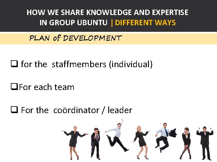 HOW WE SHARE KNOWLEDGE AND EXPERTISE IN GROUP UBUNTU | DIFFERENT WAYS PLAN of DEVELOPMENT q for the staffmembers (individual) q. For each team q For the coördinator / leader