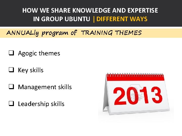 HOW WE SHARE KNOWLEDGE AND EXPERTISE IN GROUP UBUNTU | DIFFERENT WAYS ANNUALly program of TRAINING THEMES q Agogic themes q Key skills q Management skills q Leadership skills