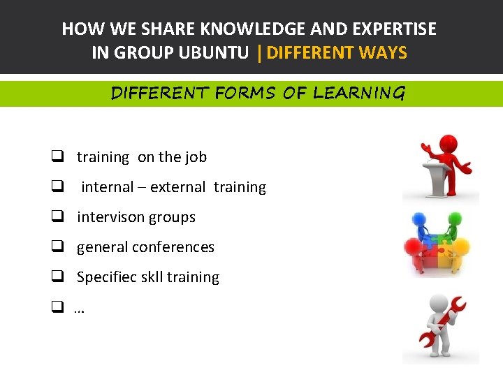 HOW WE SHARE KNOWLEDGE AND EXPERTISE IN GROUP UBUNTU | DIFFERENT WAYS DIFFERENT FORMS OF LEARNING q training on the job q internal – external training q intervison groups q general conferences q Specifiec skll training q …
