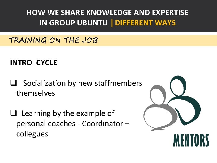 HOW WE SHARE KNOWLEDGE AND EXPERTISE IN GROUP UBUNTU | DIFFERENT WAYS TRAINING ON THE JOB INTRO CYCLE q Socialization by new staffmembers themselves q Learning by the example of personal coaches - Coordinator – collegues