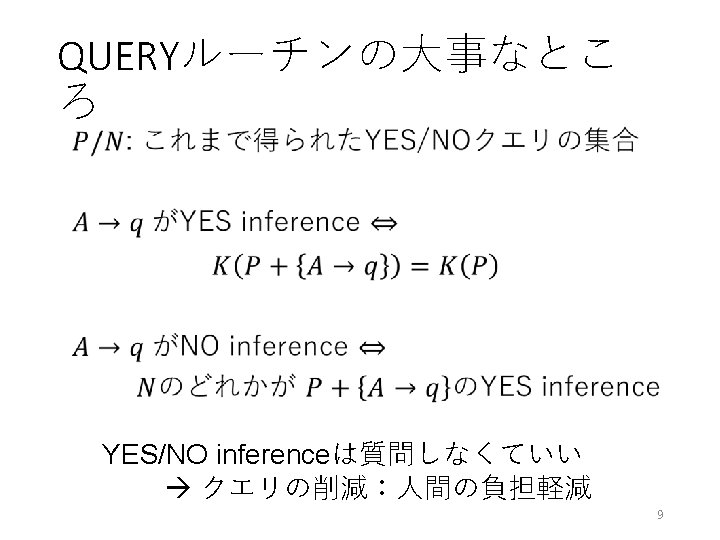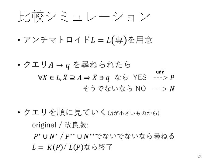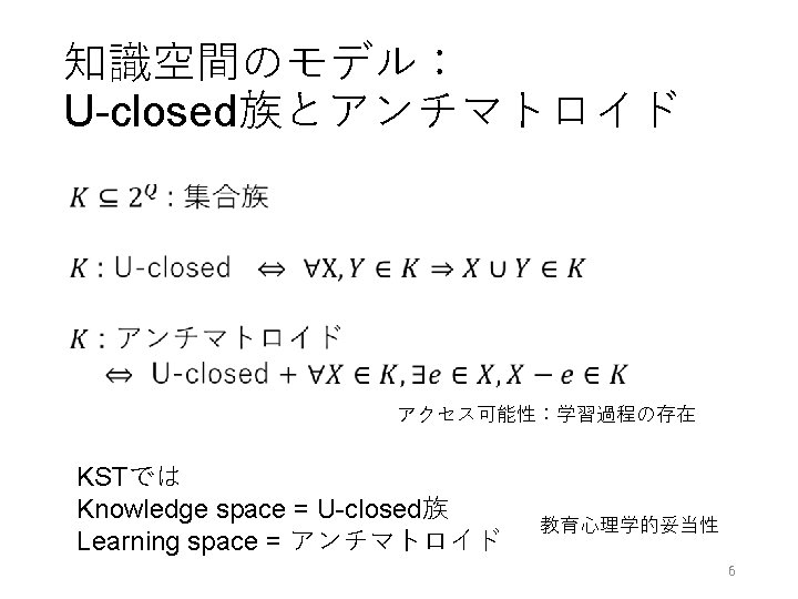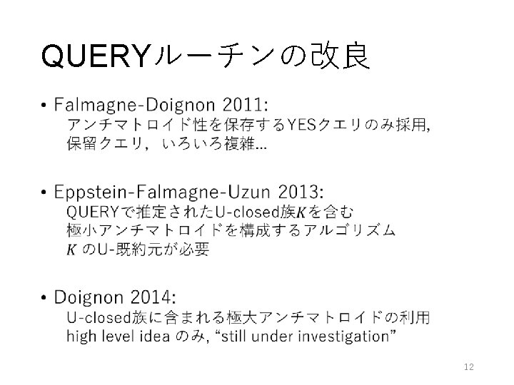 QUERYルーチンの問題点 • learning space Falmagne-Doignonの問題[Learning Spaces, p. 335] …, can a learning space approximating L be derived by the querying method through some elaboration of QUERY? 11