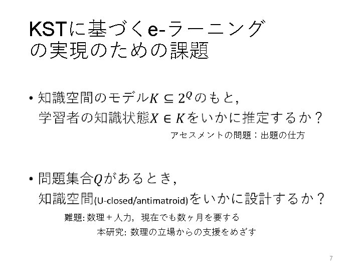 ALEKS is based upon original theoretical work in a field of study called "Knowledge Space Theory. " Work in Knowledge Space Theory was begun in the early 1980 s by Dr. Jean-Claude Falmagne, an internationally renowned mathematician and Professor of Cognitive Sciences who is the Chairman and founder of ALEKS Corporation. http: //www. alecks. com より引用 5