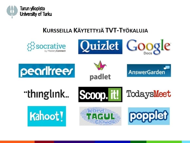 KÄÄNTEINEN OPETUS (FLIPPED CLASSROOM) PERINTEINEN OPPITUNTI KÄÄNTEINEN OPETUS • Opettaja jakaa tietoja ja varmistaa, että opiskelijat ymmärtävät asian • Luokassa opiskelijat kuuntelevat ymmärtääkseen • Opiskelijat käyttävät tietojaan ja ymmärrystään tehtävien tekemiseen kotona → usein tehtäviä ei osata tehdä itsenäisesti • Opettaja jakaa erilaista materiaalia (tekstiä, videoita, kuuntelumateriaalia) • Opiskelijat hankkivat ja jakavat tietoja TVT: n avulla • Opiskelijat käyttävät taitojaan ja ymmärrystään tehtävien tekemiseen tunnilla → opettaja voi ohjata ja auttaa opiskelijoita