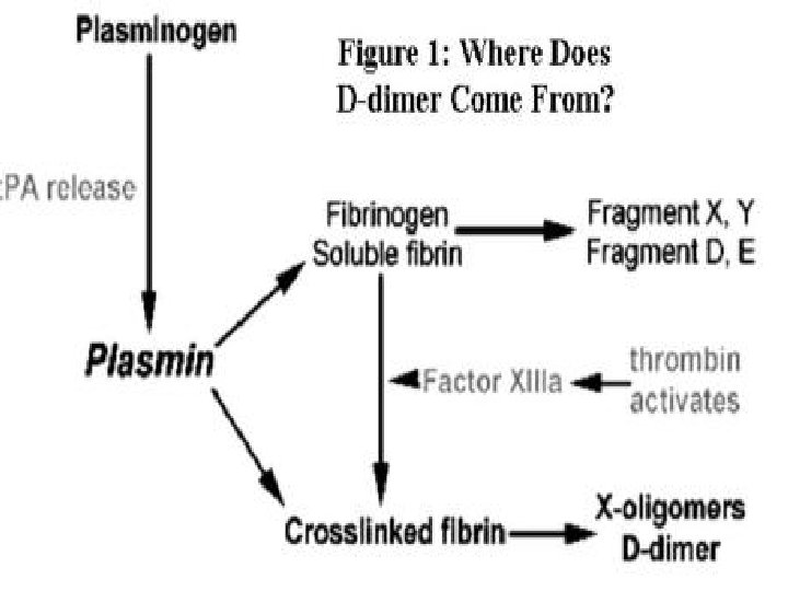Fibrinojen Çapraz bağlanmamış fibrin Thrombin Çapraz bağlı fibrin XIIIa plasmin Fibrinojen yıkım ürünleri(FDPs) Çapraz bağlı olmayan FDPs Aα polar uzantı(A, B, C, H) Bβ 1 -42 X, Y, D, E Aα polar uzantı(A, B, C, H) Bβ 15 -42 X, Y, D, E Çapraz bağlı FDPs Polar uzantı polimerler(αp) D dimer X, Y, D, E