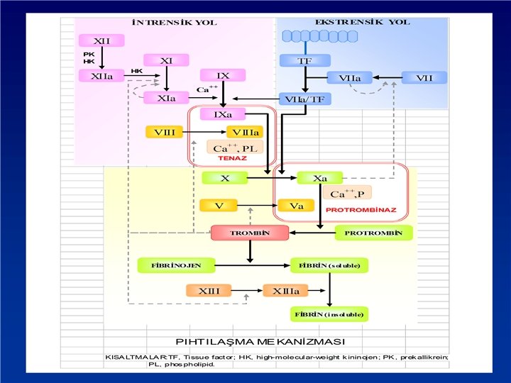 Fibrinolitik sistem l l Plazminojen(zimojen) plazmin(enzim) plazminojen aktivatörleri/ inhibitörleri Plazminojen aktivatörleri damar duvarı ile(intrensek aktivasyon= faktör XII, faktör XI, Prekallikrein(PK) ve HK(kininojen) veya dokular tarafından (ekstrensek aktivasyon=doku plazminjen aktivatörü(t-PA) üretilir.